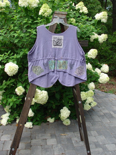 The Vest is from the Summer Collection of 1993 in Periwinkle in Almost Perfect Condition with one mark lower left hem made from Double Layered Cotton ~ The Features Include: 4 Original Blue Fish Buttons ~ Tuxedo Style Front Tails ~ A Wider Shape ~ An Upward Rounded and a Crop Draw Corded Back accented by Thicker Cording ~ A Heart Signature 93 Patch ~ Plus The Cultivated Mushroom Garden Theme Paint. Super Vintage at its Best! The Measurements are as Follows: Bust 52 ~ Waist 52 ~ Hips 54 ~ Front Length 25 ~ and the Back Length 18 Inches
