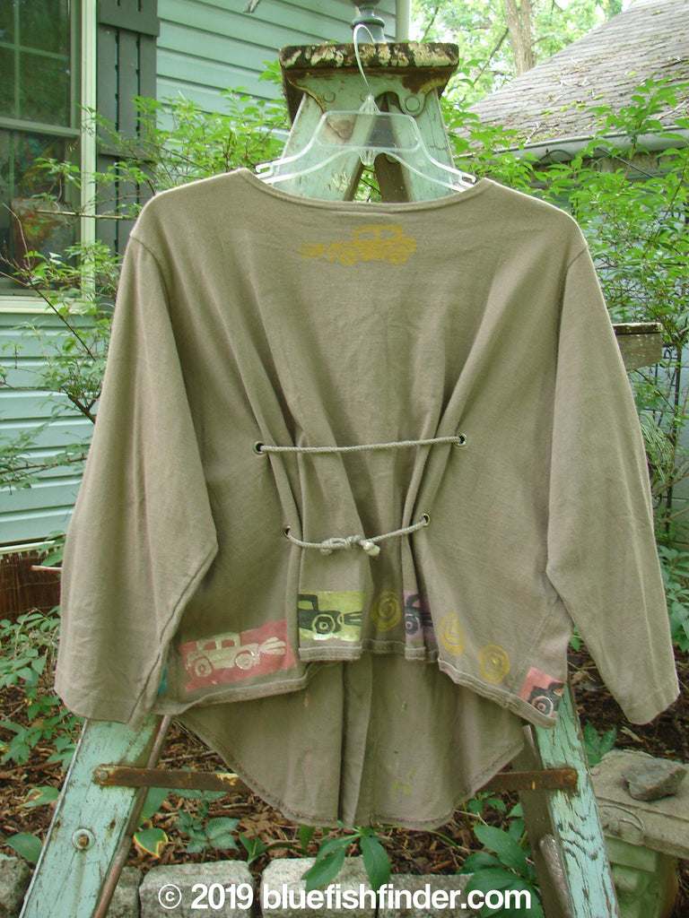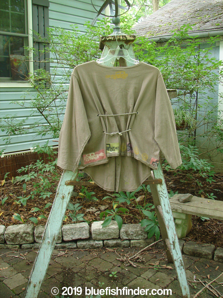 This Tie Back Jacket is from the Fall Collection of 1993 in Bay Leaf in Perfect Condition made from Mid Weight Cotton. The features Include a Top Vintage Button ~ Followed By all the Original Buttons ~ A Slightly Shallow Neckline ~ Drop Shoulders ~ Varying Front Back Hemline ~ Superior Travel by Antique Car Theme Paint ~ Original Double Drawcord Back ~ Metal Grommets and Is Just the Sweetest Vintage Collectible! The Measurements are as Follows Un gathered: Bust 56 ~ Waist 57 ~ Hips 60 ~ Front Length 30 ~ Back Length is 19 and the Sides Measure 22 Inches.