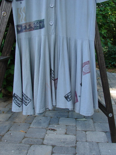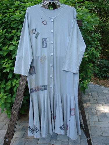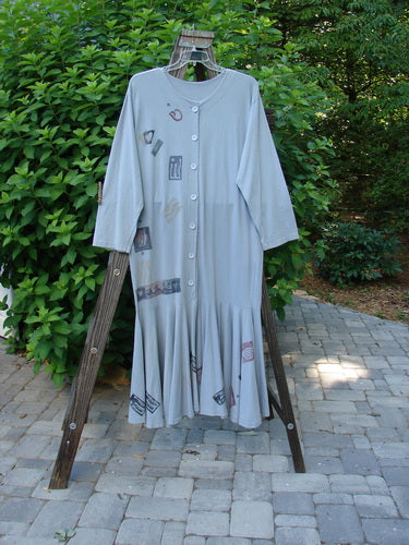 This Column Dress is from the Winter Collection of 1994 in Solstice Blue in Perfect Condition made from Mid Weight Cotton. The Features include: A Full Front Button Duster Type Shape ~ Amazing Abundant Elongating Paint Done in the Supreme Heart Theme ~ A Serious Full Bottom Kick Flounce ~ A Straighter Bodice Elongating Measurement ~ V Shaped Neckline ~ Longer Sleeves and a Back Upper Shoulder Panel. The measurements are as Follows: Bust 50 ~ Waist 50 ~ Hips 50 ~ Sweep 120 and the Length is 53 Inches.