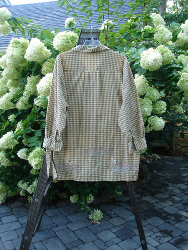 This Tourist Top is from the Summer Collection of 1996 in a White Pine Gingham in Perfect Condition made from a Light Weight Smoothed Cotton Percale. The features Include: A Full Tiny Wooden Button Button Front ~ Lower Sleeves which can be Buttoned at The Cuff or Rolled ~ Vented Sides ~ Soft Continuous Fish Border Theme Paint ~ A Stand up Collar Plus a Rear Upper Shoulder Seam. This Pieces Presents like a Country Work Shirt with Agreeable Side Vents!  The Measurements are as Follows:  Bust 56 ~ Waist 58 ~ Hips 60 and the Length is 34 Inches.