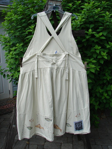 This New With Tag Tadpole Jumper is from the Summer Collection of 1999 in Natural in Perfect Condition made from Organic Cotton. The Features Include: Fully Adjustable Shoulder Straps ~ A Huge Sweeping Hemline ~ A Drawcord Criss Cross Lower Back ~ A Downward Yoked and Slight Empire Double Paneled Waistline ~ A Nifty Lower Horizontal Seam ~ Two Sweet Round Bottomed Pockets ~ Single Stripe Pike Theme Paint and The Signature Blue Fish Patch. The Measurements are as Follows: Bust 40 and Open ~ Waist 50 ~ Hips 60 and the Length is 46 to 52 Inches depending on the Shoulder Lengths.