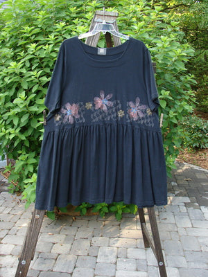 This Rosalee Dress is from the Spring Collection of 2000 in Black in Perfect Condition Made from Organic Cotton ~ The Features of this Sweet Swingy Babydoll style Piece Include: A Slightly Dropped and Gathered Waistline ~ A Huge Sweeping Swingy Lower ~ A Gently Scooped Rounded and Paneled Neckline ~ A Nifty Fully Gathered Waist Seam ~ Generous Continuous Floral Theme Bodice Paint and the Sweet Signature Blue Fish Patch! The Measurements are as Follows: Bust 58 ~ Waist 60 ~ Hips 80 ~ Length 38 and Hem Circumference is 120 Inches.