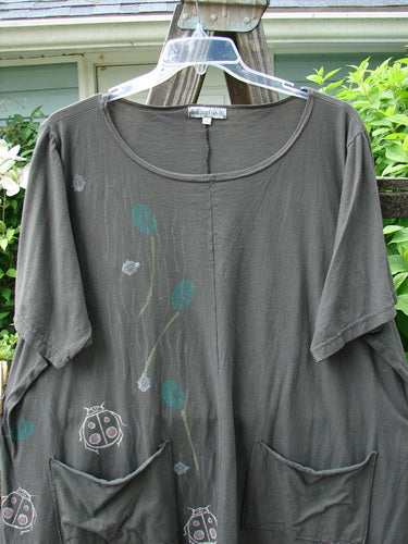 This Barclay Seedling Top is from a Summer Collection in Grey Hunter in Perfect Condition made from a Medium Weight Organic Cotton. The Features include: A Sweet Ruffle Hem Circumference ~ Banded Lower Sleeves ~ Double Drop Pockets ~ An A Line Shape ~ Ladybug Theme Paint ~ A Softly Rounded Neckline and An Un seamed Bodice. The Measurements are as Follows Bust 60 ~ Waist 60 ~ Hips 60 and the Length is 30 inches.